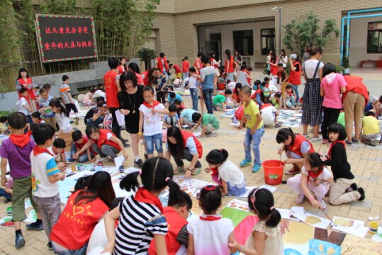 调色、填色、洗画笔……华润小学内的空地上,一百二十多名一年级学生在悠扬的音乐声中画的不亦乐乎,最终在志愿者的帮助下共同绘制了5幅油画展板并挂在了墙上。其中,不仅有局小校友袁晓园书诗言志的故事,还有唐荆川荐官车夫、淹城三墩、金坛封缸酒的由来和溧阳大刀会领袖“小妹妹”的历史故事。